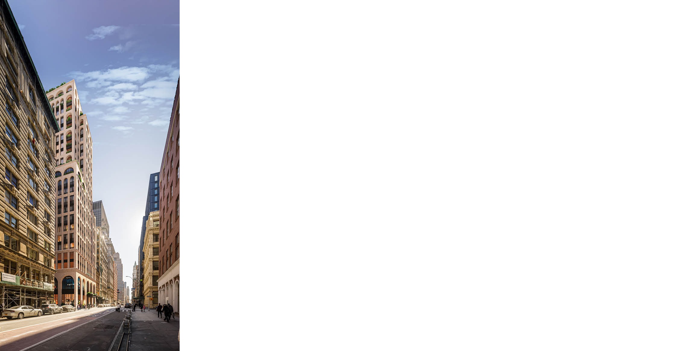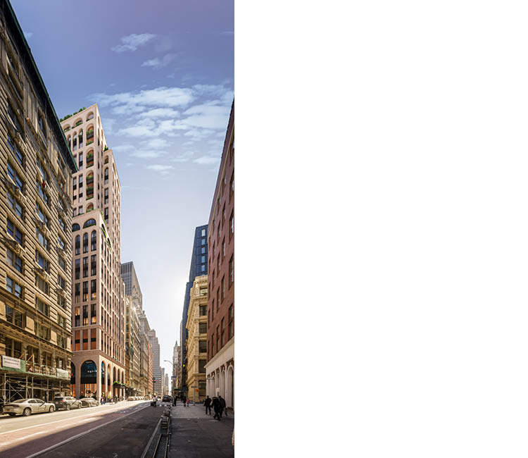 Through its materiality, massing, and connection to nature, 65 Franklin Street restores a sense of place and continuity to a corner of New York’s most iconic thoroughfare.