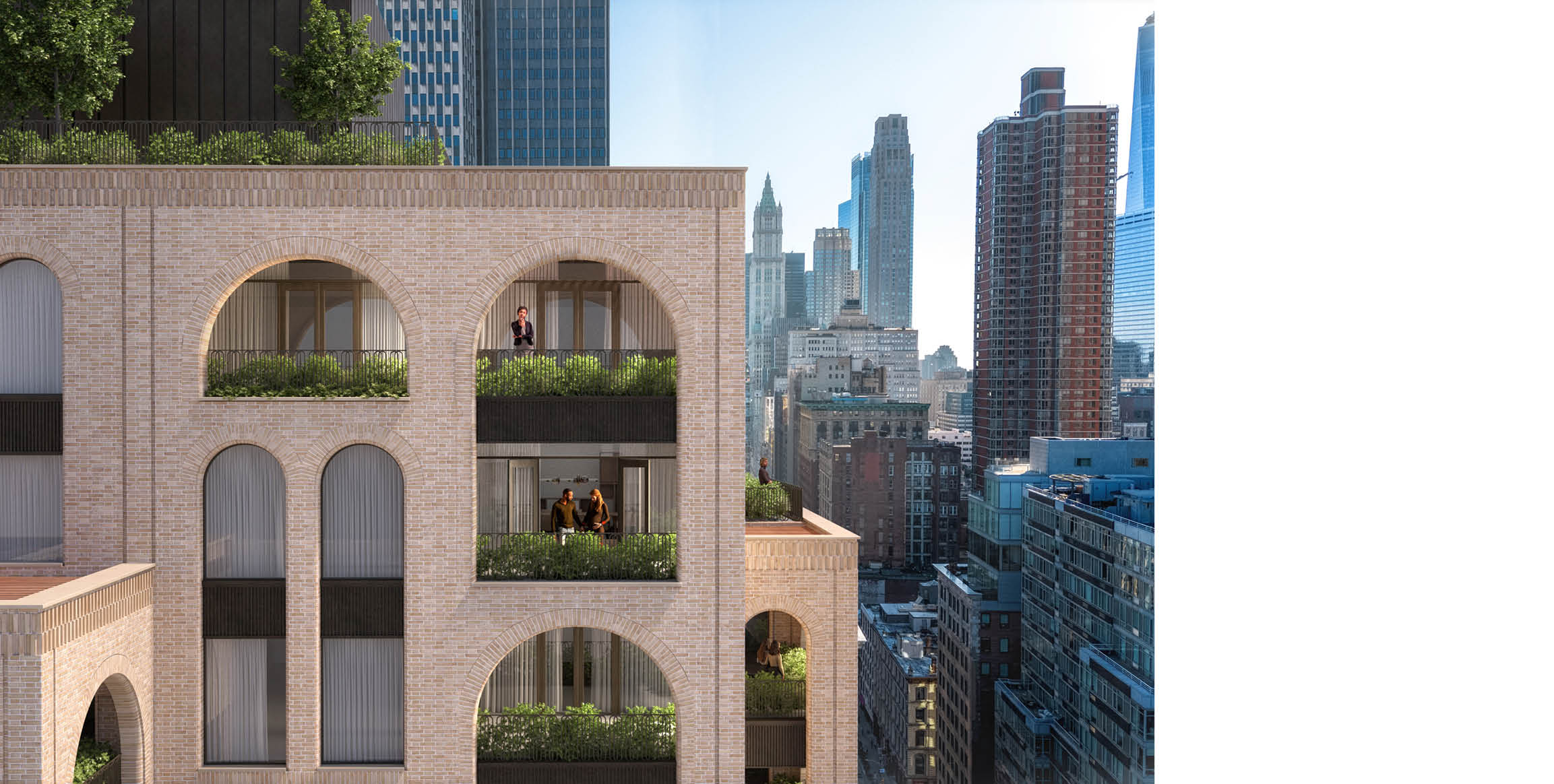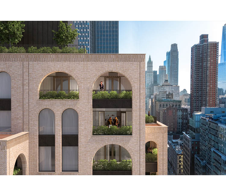 While the neighborhood’s 19th-century masonry building stock and cast iron structures serve as inspiration, the design is decidedly modern. A recurring series of arches is the building’s defining architectural expression. The facade itself is composed of hand-laid molded brick, creating a rich texture that catches the play of light and shadow throughout the day. This masonry aesthetic achieves visual continuity along the streetscape, integrating seamlessly into the environment, even as the tower announces its presence via the prominent corner location and a massing articulated by setbacks and landscaped loggias. Graphite-colored metal spandrels divide the gridded facade and nearly five foot-wide windows. Molded brick and bull-nosed edges give the openings a soft, sculptural presence that reads as organic and tactile.