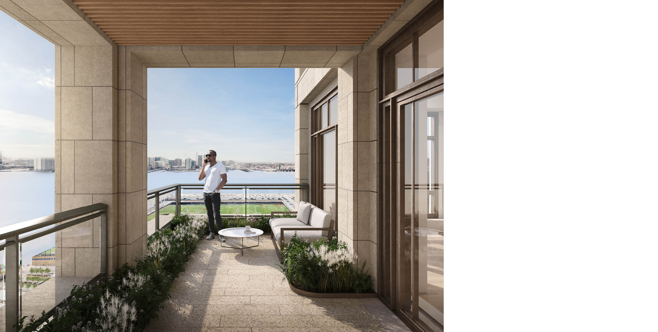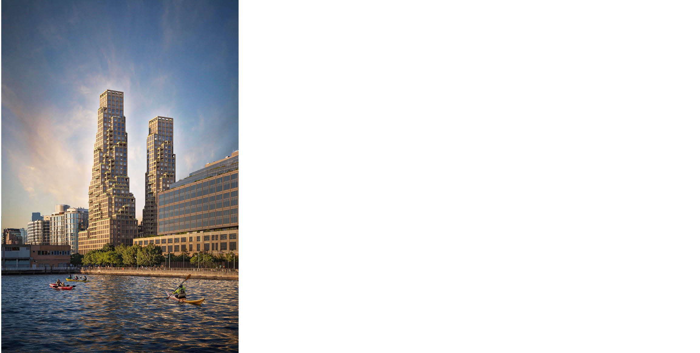 80 Clarkson is composed of two towers rising from a shared podium, shaping the skyline while preserving light and views. The towers are conceived as a modern interpretation of the classic New York City setback skyscraper, with stepped forms that create a cascade of terrace gardens, loggias, and balconies. These planted setbacks introduce a biophilic layer that softens the building’s massing and connects residents to nature. Integrated greenery allows for indoor-outdoor living, providing outdoor space at nearly every residential level of the building. Over half of residences include private gardens.