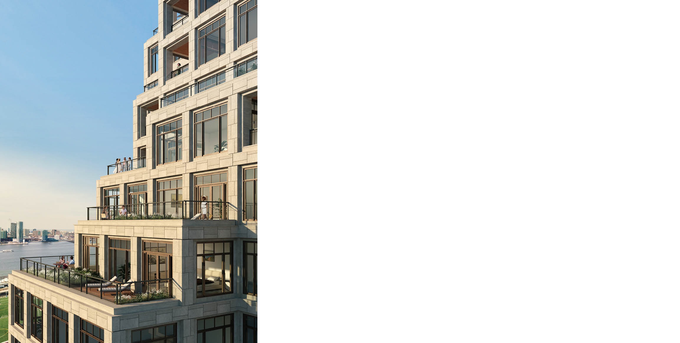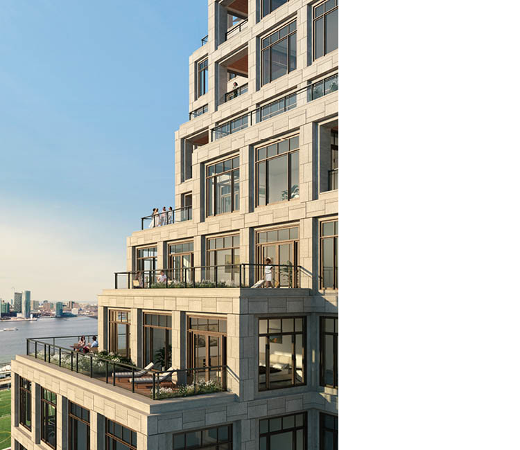 Clad in variegated Indiana limestone, the facade is rooted in the rich history of New York City limestone buildings, and draws inspiration from abstract forms like the basalt formations of the Hudson River Palisades and Sol Lewitt’s cubic sculptures. The deep facade creates shadow and texture, further expressing the building’s grid. Multi-light windows bring generous daylight deep into the residential interiors, providing incredible views of the city and Hudson River.
